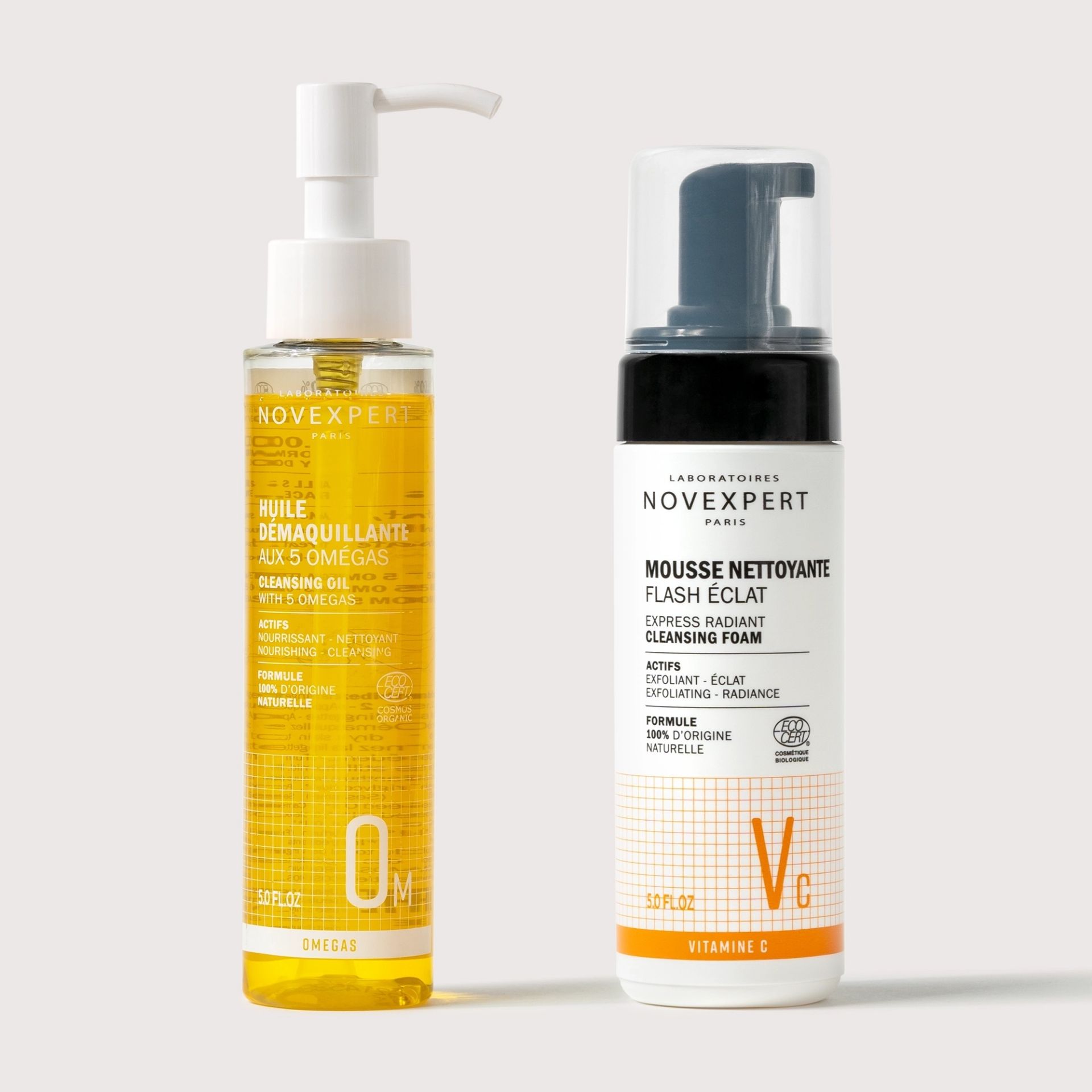 Rituale professionale di doppia detersione 100% naturale per pelli normali. Olio detergente ai 5 Omega + Mousse Flash Éclat per una pelle più pulita, illuminata e visibilmente più fresca fin dal primo utilizzo.